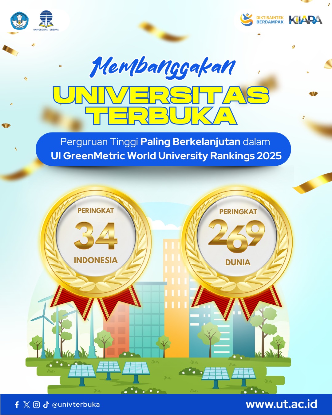 utgu2026-01-14 11:39:112026-01-14 11:44:52UT Melesat di UI GreenMetric 2025: Tegaskan Posisi sebagai Green Open UniversitySejak 2010 UT telah menyadari pentingnya untuk ikut andil dalam mengatasi permasalahan lingkungan dengan mencanangkan slogan UT Go Green. Sejumlah program telah dilaksanakan baik di UT Pusat maupun UT Daerah seperti pengurangan penggunaan kertas, penanaman pohon langka di sekitar kampus, pembangunan danau buatan, pengelolaan sampah, pembuatan biopori dan pengembangan eco building